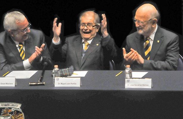 “La verdad mi vida ha sido muy feliz. Estoy en paz con la vida, ha sido generosa conmigo”, dijo durante su discurso. “Mi vida ha sido una serie de novedades para mí”. Acompañado por universitarios, académicos, funcionarios y ex rectores, el historiador e investigador emérito don Miguel León-Portilla agradeció a la universidad, y a quienes fueron sus maestros, además de a su esposa y a sus colegas.
